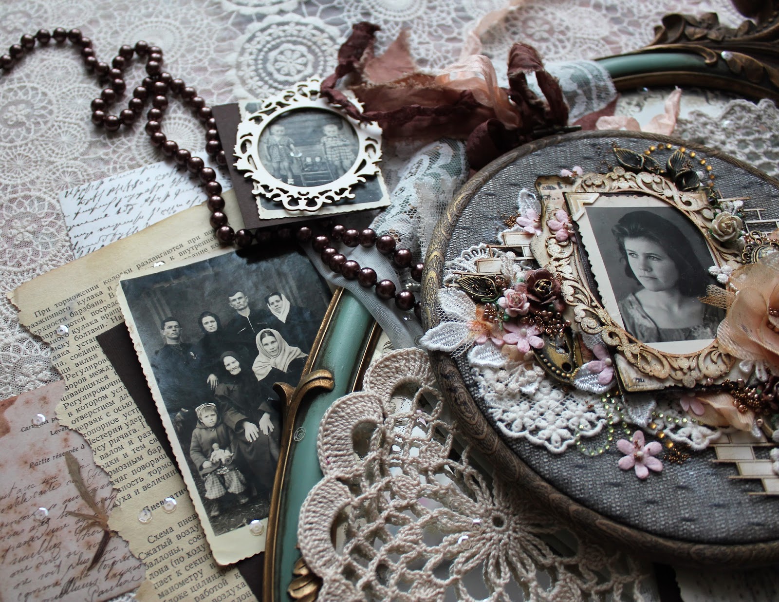 Итак, специально для блога Chipboards.ru у меня родилась дорогая моему сердцу работа Винтажные пяльцы! А дорогая потому, что на фото моя мамочка!!! Очень очень люблю эту фотографию! В работе использовала самые любимые материалы - это чипборд, кружево, цветы и металлические элементы!